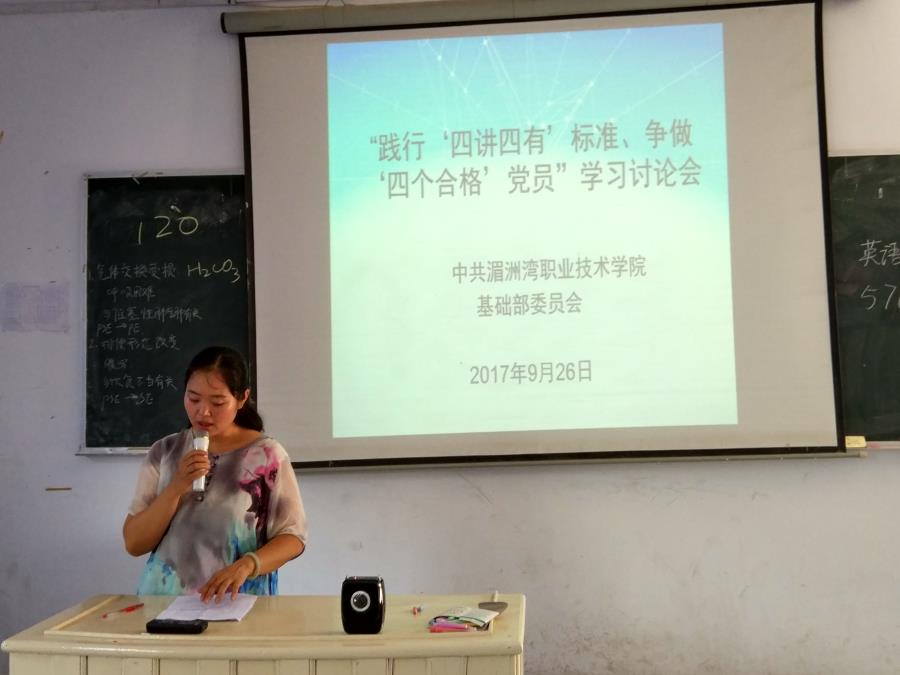 为扎实推进“两学一做”教育常态化、制度化,9月26日下午2:30,基础部开展“践行‘四讲四有’标准、争做‘四个合格’党员”学习讨论会。会议由基础部陈国平书记主持,杨丽贞主任、各教研室主任和全体党员教师参加会议。