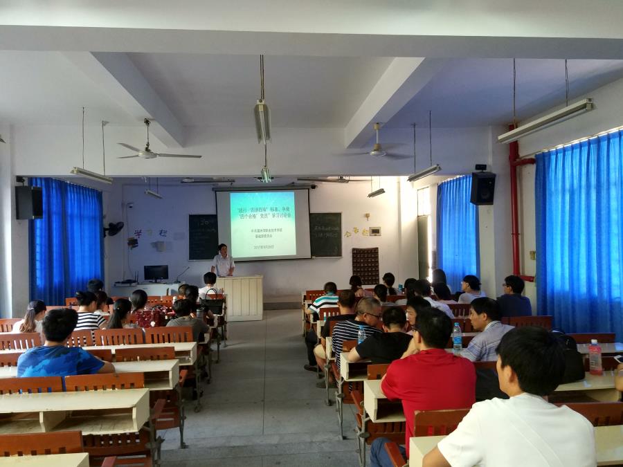 会议由基础部陈国平书记传达了践行‘四讲四有’标准、争做‘四个合格’党员”的文件精神要求。支部书记提出以下几点要求:要求全体党员要讲政治、有信念,做到政治合格;要将规矩、有纪律,做到执行纪律合格;要讲道德、有品行,做到品德合格;要将奉献、有作为,做到发挥作用合格。