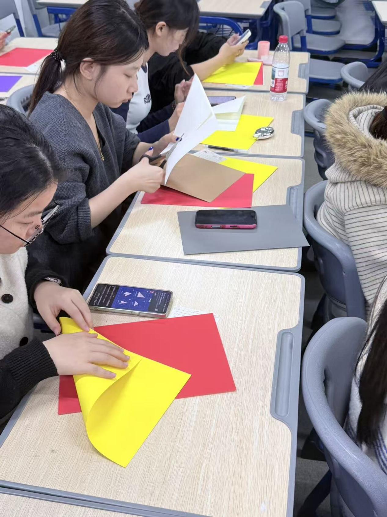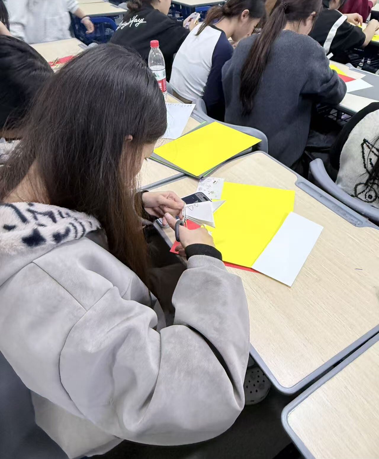 剪纸体验环节将活动氛围推向高潮。主持人首先向大家生动地介绍了剪纸的悠久历史、南北流派的鲜明差异,以及雪花、福字等吉祥纹样所蕴含的美好寓意。随后,活动负责人借助大屏投影,现场精彩演示了月牙纹、锯齿纹、水滴纹等基础剪纸技法,以及对折、四角折等对称折叠方法。在分发练习用纸后,同学们纷纷拿起剪刀,热情跟练,从生疏摸索到娴熟操作,逐步掌握了剪纸的基本技巧,现场洋溢着动手实践的欢乐与成就感。